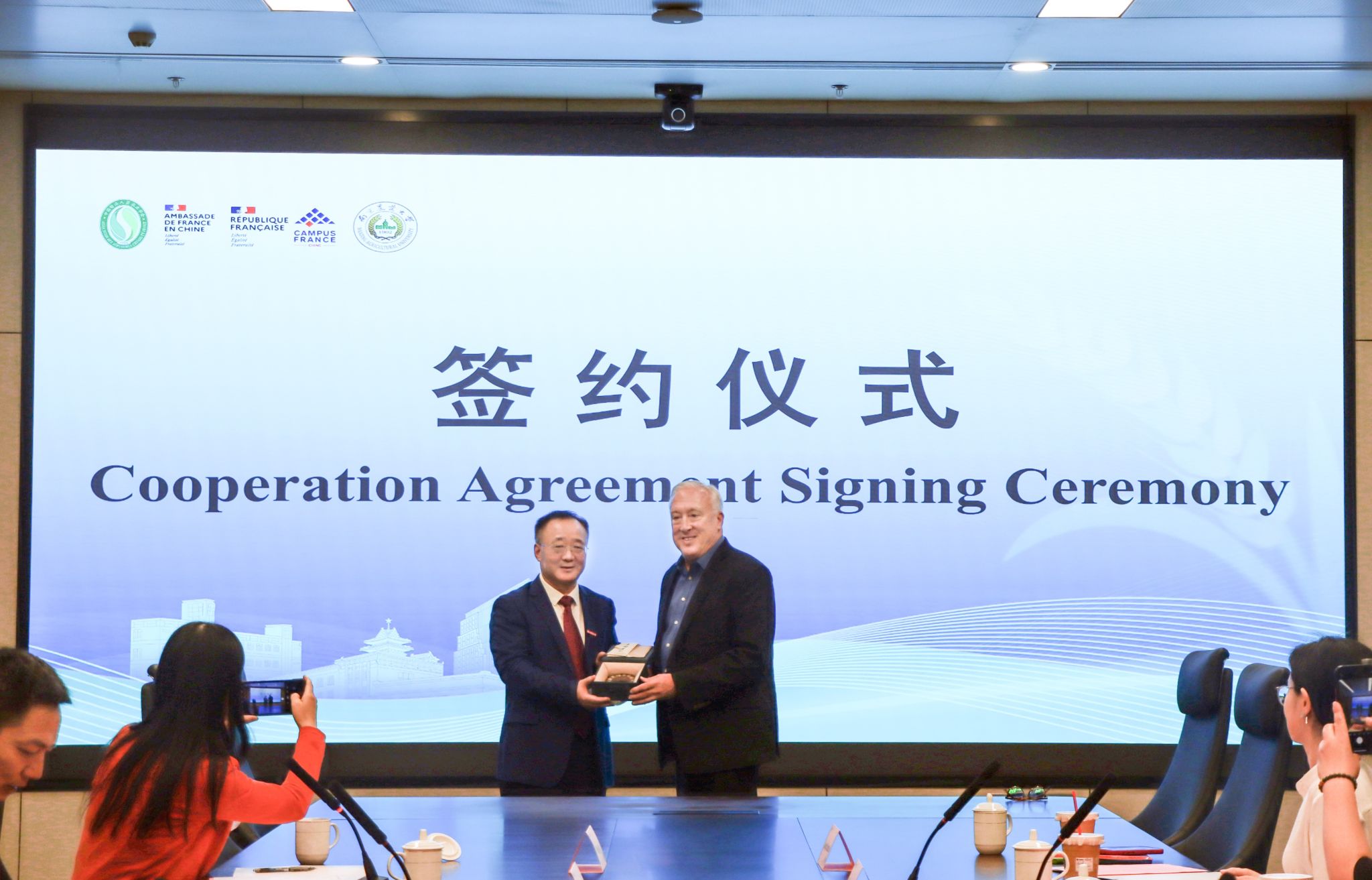 吴磊与翁芳芳共同签署南京农业大学与中国留法人员农业学会合作备忘录,林光华与Jasper Barnes共同签署南京农业大学前沿交叉研究院与SynTech Research 集团合作框架协议,单正丰、Jasper Barnes代表双方互赠纪念礼物,进一步彰显了中法双方在农业科技