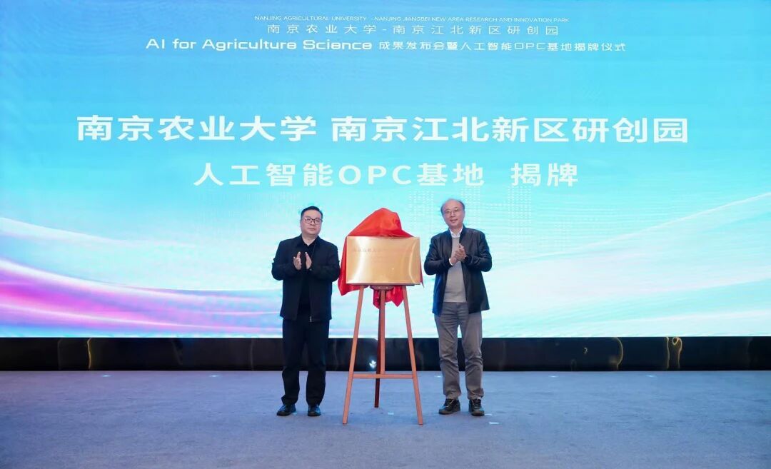 发布会现场,丁艳锋与江北新区研创园党工委书记、管办主任吴恒共同为“南京农业大学-南京江北新区研创园人工智能OPC基地(AI for Agriculture Science)”揭牌。该基地聚焦AI与农业科学交叉领域,将推动技术攻关、成果转化与人才集聚,构建产学研用一体化平台,为校地合作提供产业视角与应用场景。
